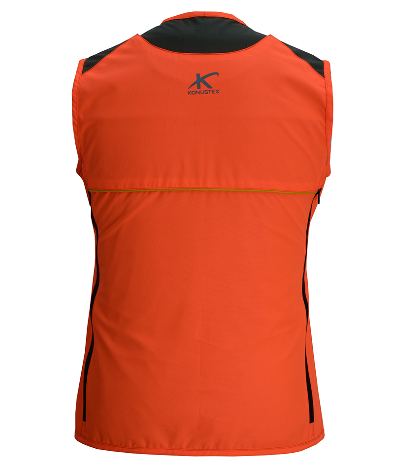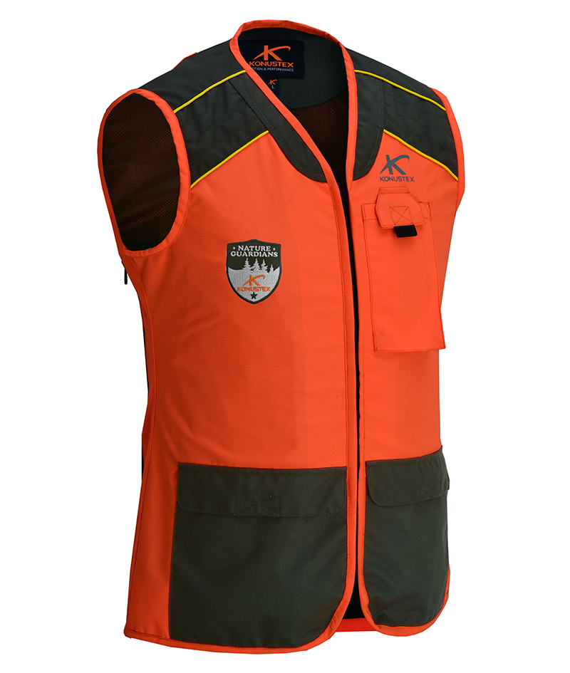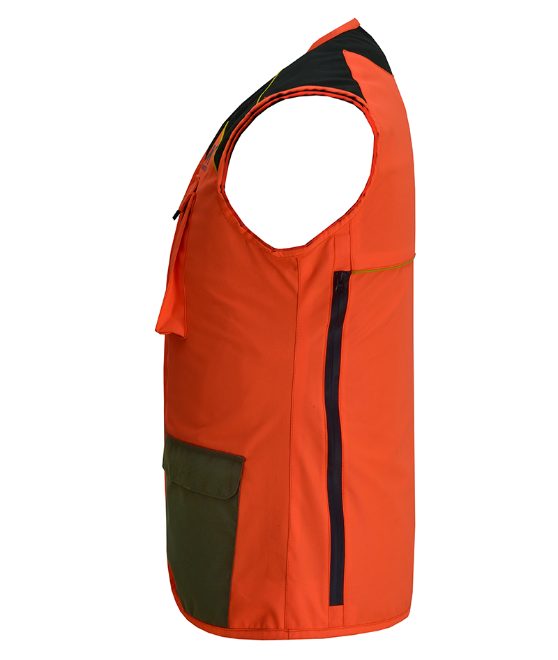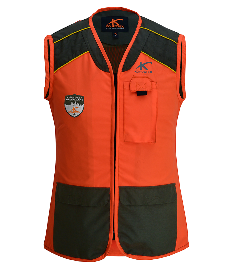 Damenweste für die Drückjagd auf Schwarzwild Ein robustes und wasserabweisendes Kleidungsstück für Dornen und Sträucher, ideal für Jagdausflüge dank der Taschen, der Schulterpolsterung und der Tasche zum Einstecken von Funkgeräten. Die gut sichtbare orange Farbe garantiert die Sicherheit der Jägerin, während das Mesh-Futter die Atmungsaktivität des Kleidungsstücks fördert.